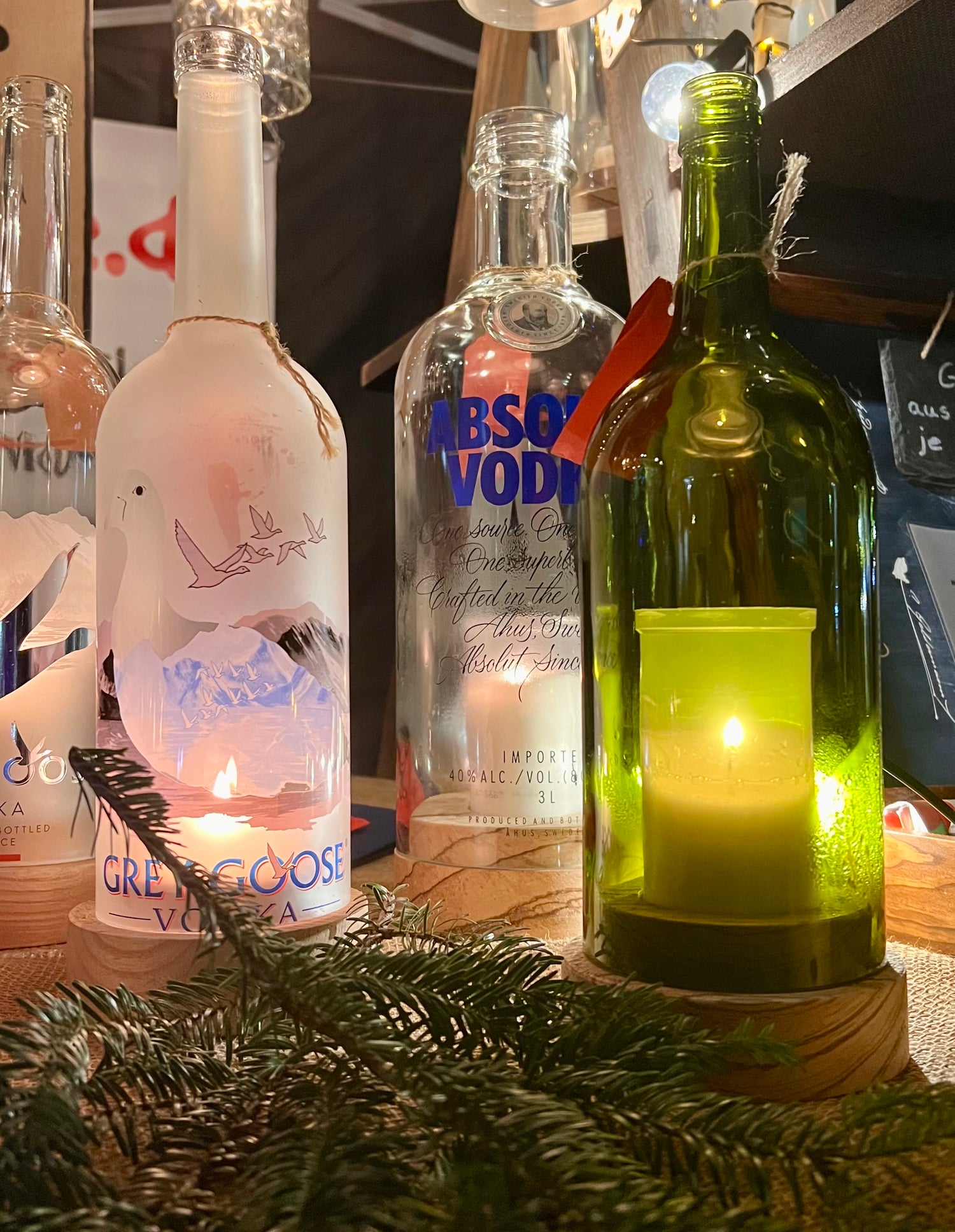 Handgefertigtes Windlicht aus Absolut Vodka Flasche – gedrechselter Holzsockel – flackerndes Licht Glasrelief Limited Edition – mit Teelicht