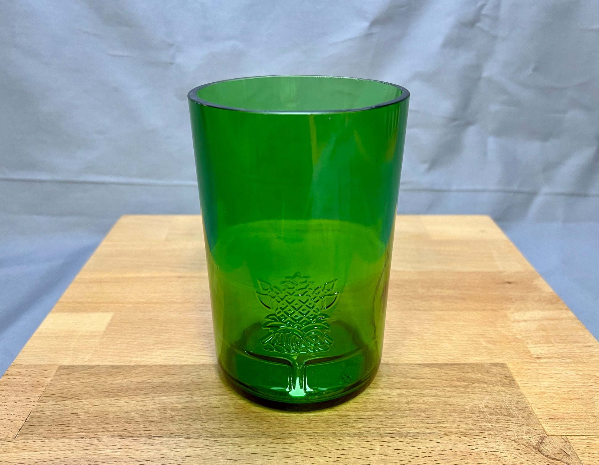Aus einer leeren Tanqueray Gin Flasche - hier in grün und eine 0,7 Liter Flasche - habe ich ein einzigartiges Glas gemacht. Das Oberteil der Flasche wurde abgetrennt und die Kante des Glases so geschliffen, dass man gefahrlos daraus trinken kann.